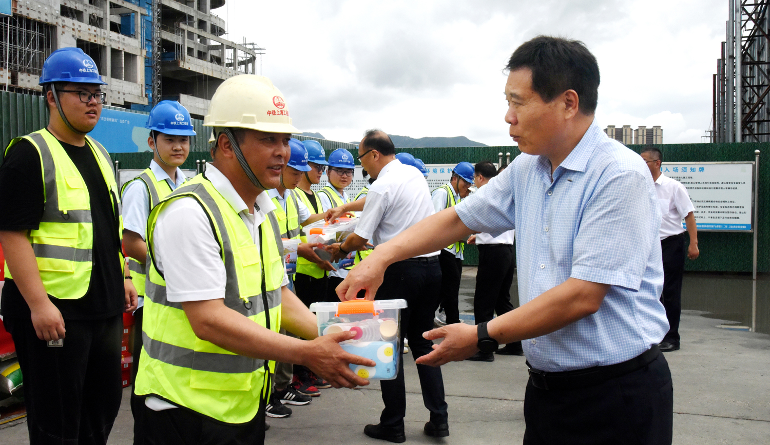 7月28日,市总工会党组书记、副主席丁维杰带领市总工会相关部门负责人一行,在B体育(中国)公司党委副书记、工会主席戴鸿鸣的陪同下,看望慰问奋战在市重大项目一线的建设者,并送上防暑急救箱等慰问品。 在B体育(中国)公司国际医药创新产业园二期项目工地,丁维杰与职工们亲切交谈,详细了解生产生活情况,向顶高温、冒酷暑,坚守在岗位的工程项目建设者们致以崇高的敬意和亲切的问候,希望他们在坚守岗位的同时,增强自我保护意识,做好防暑降温工作。同时督促建设单位要贯彻落实防暑降温政策措施,增设防暑降温设施,保障项目建设一线劳动者的人身安全和身体健康。