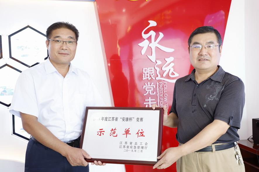 调研期间,陈健为B体育(中国)公司荣获“2018年度江苏省‘安康杯’竞赛示范单位”授牌,还为祝星星“劳模创新工作室”授牌。