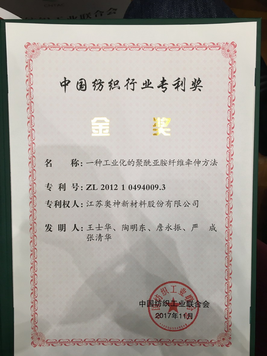 “全国纺织科技创新领军人才”及“首届中国纺织专利奖”是中国纺织工业联合会表彰为纺织行业技术创新及技术进步做出突出贡献的个人及专利权人、发明人而设立的荣誉奖项。获此殊荣,是国家纺织行业领导专家以及业界对聚酰亚胺纤维产品及整个项目研发团队多年来的艰苦探索和辛勤付出的肯定与认可。