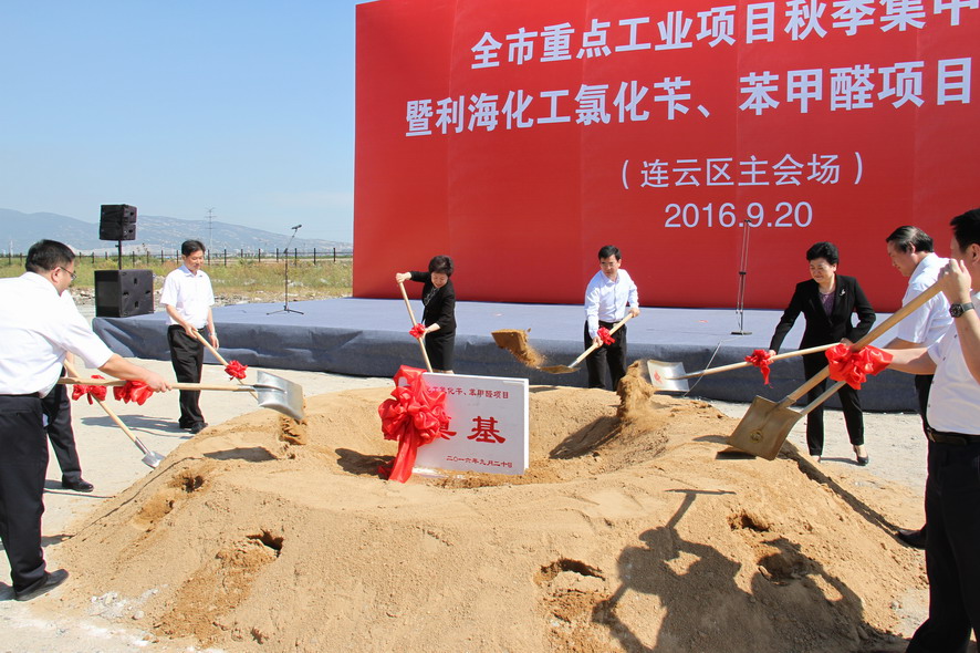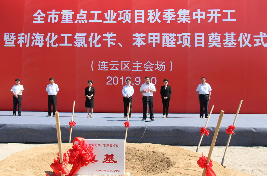 9月20日,我市重点工业项目秋季集中开工(连云区主会场)暨利海化工氯化苄、苯甲醛项目奠基仪式在利海公司举行,市委书记、市人大常委会主任杨省世,市领导杨莉、董恕娟、徐家保、鲁林,B体育(中国)公司董事长、党委书记杨龙、总经理胡建明等出席开工仪式。