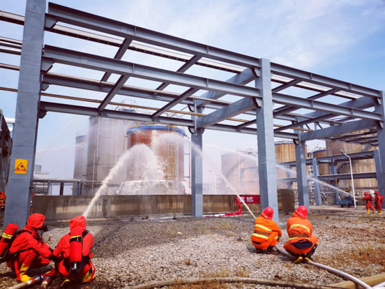 本次演练坚持从实战出发,模拟中间罐区重芳烃泄漏发生火灾,造成人员受伤。演练过程中,巡检工在库区周边巡查,发现重芳烃储罐出口管道泄漏,引起着火,立即打开重芳烃储罐喷淋水,同时拨打119报警电话,公司迅速启动公司级应急救援预案。指挥人员沉着冷静,由该公司100余名员工组成的各个应急救援小组快速反应,到集合点集合,开展灭火、搜救行动。总指挥许总向园区综合执法局报告现已启动公司级应急救援预案进行抢险,请求园区消防队支援。6分钟后,消防车抵达,与消防站长迅速对接,介绍火情,布置任务后。该公司抢险救援队与园区消防大队消防员密切配合,开展人员疏散、伤员搜救、大气检测、多角度水带喷射泡沫灭火等操作。迅速控制了险情,圆满完成了预定科目的演练。