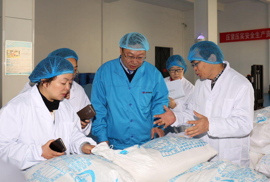 11月7日,组长高湘陵、省经信委消费品工业处姜辉、张洪忠处长一行在市经信委副主任卢忠宝的陪同下,到金桥制盐公司进行国家食盐定点生产企业证书、食盐批发许可证书换证验收审核。B体育(中国)公司总经理胡建明、总会计师匡友本参加验收。