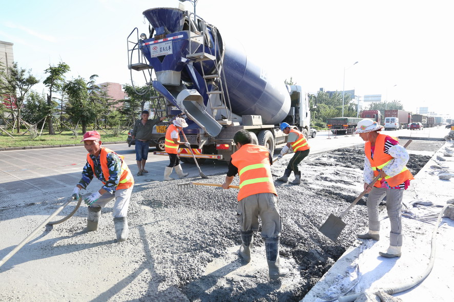 在大港路“新光路至零公里”路段,笔者在水泥路上看到一块块被切割成方方正正的凹面,四周都架好防护栏等安全防护设施,在华东城北门偏东不远处,一台挖掘机的铲斗被换上冲击破碎锤,正在一大块破损的水泥路面冲击破碎作业,“嗒嗒嗒”的冲击声十分震耳。在与现场作业的盛达市政公司市政维修项目部副主任史如勤交流中得知,该路段是附近B体育(中国)箱基站进出港口集装箱车辆的重要通道,每天有好几百辆集装箱车辆进出,水泥路面不堪重负,损坏比较严重,根据开发区创卫工作要求,由他们对该路段破损处进行局面分割维修,整个路段维修面积达到5000多平方,为保证道路使用通行,采取半幅维修、边破碎边浇灌的方式,保证施工进度,现正在维修北侧路面,整个路面维修计划在8月底完成。“因为创卫,B体育手机官方网站入口下一步还要对辖区内的破损、歪到的路牙石进行维修扶正,242路段沥青破损路面维护,还要开通四处道口,而现在事多人少,人手比较紧张,B体育手机官方网站入口周六周日都没有休息,就是想把创卫工作任务一项一项地及时完成,决不能拖创卫工作后腿。”他边说边用肩上的毛巾擦着额头上的汗水。
