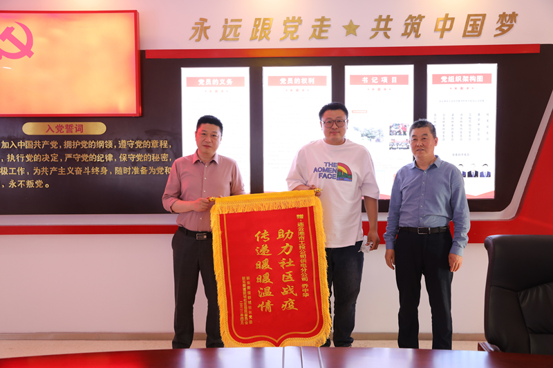 5月5日下午,新东街道新城社区居委会工作人员来到公司,为感谢公司党员乔中华在该社区疫情防控期间守护居民群众的健康安全,为打赢疫情防控阻击战发挥的积极作用,将写有“助力社区战疫 传递暖暖温情”的锦旗送到公司党委书记、总经理宋晟晔手中。