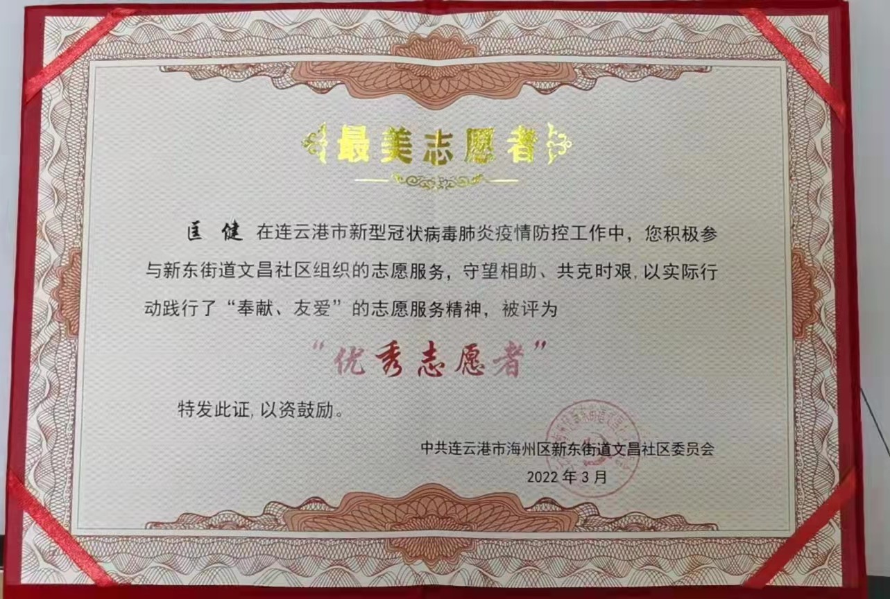 近日,公司党员匡健、王长春分别被新东街道文昌社区、路南街道朝阳社区授予“最美志愿者”和“抗疫先锋志愿者”。感谢他们在疫情防控期间舍小家顾大家,同舟共济战疫情、共克时艰同担当,守护居民群众的健康安全,为打赢疫情防控阻击战发挥了积极作用。