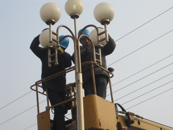 1月13日,青口供电所为了盐场春节期间的美化、亮化,组织七名职工义务为盐场抢修路灯。(宋中文)