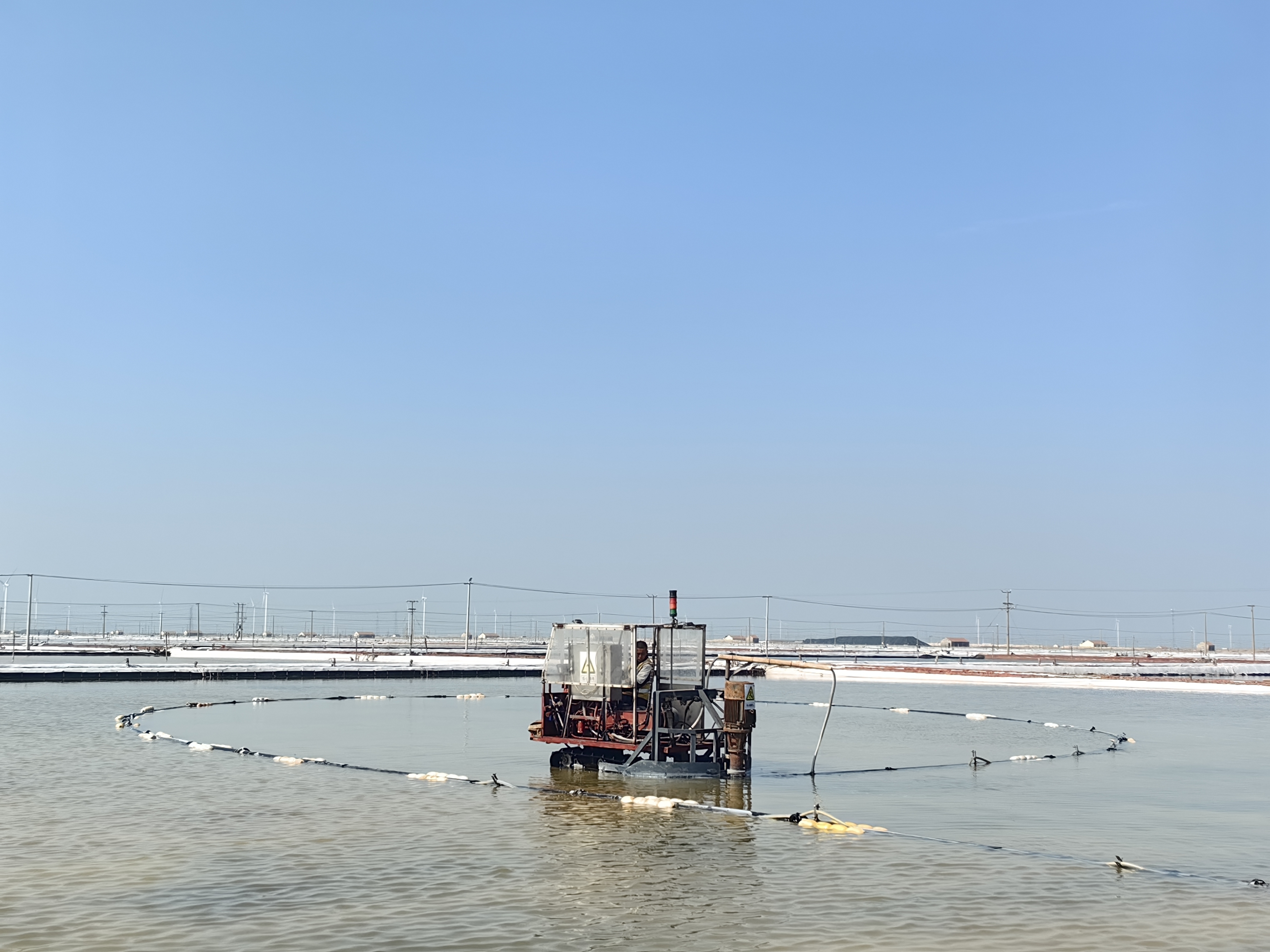 在八班扒盐现场,一台唐三零扒盐机正在盐池里进行扒盐作业,唐三零操作手驾驶着机械,在盐田中央缓缓行进着,不时的回头观察盐泵吸盐情况,确保扒盐管道顺畅。远处的廪基内,大廪工正在熟练地利用分流板对盐筛中倾泻下的原盐进行引导分流,熟练地打好廪墙。