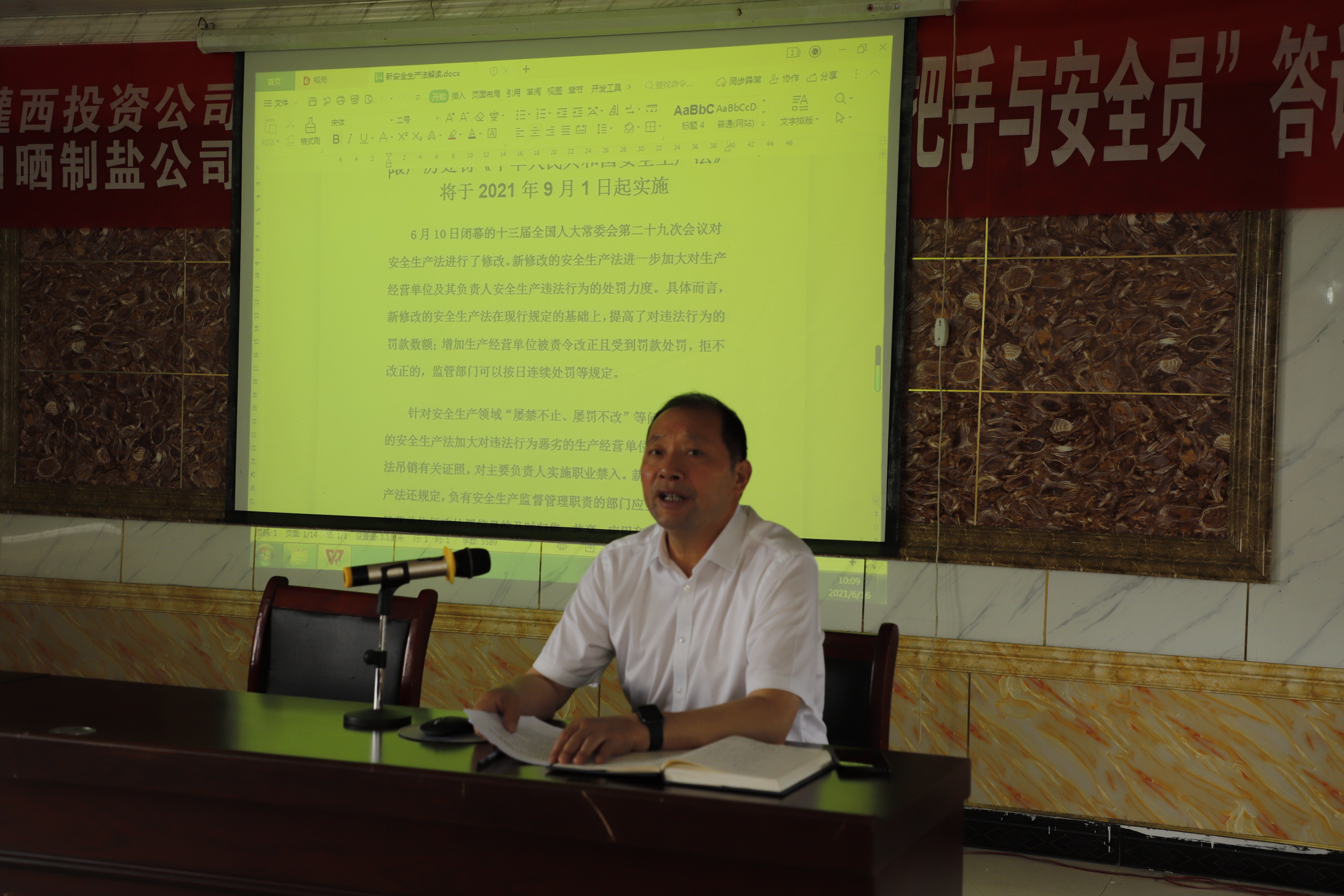 6月16日,灌西投资公司在生产服务公司召开“6.16”安全宣传日暨“一把手与安全员”答询会,党委书记、董事长、总经理李国文,常务副总经理吴卫平,党委副书记、工会主席王宏,公司安委会成员、各单位主要负责人、分管安全领导及班组长参会,工会主席王宏主持会议。