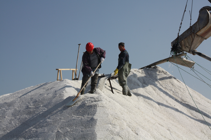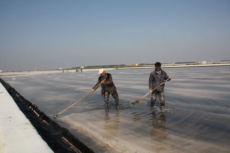 11月4日上午,在日晒制盐新河零班滩上,只见扒盐工作正在火热进行之中,洁白的盐廪在阳光照耀下分外醍目,两名大廪工在盐廪上紧张忙碌着,有的在做盐墙的,有的在引导盐流,有条不紊,配合紧密。在三排的盐池内,一台唐三零机械正缓缓集盐,另一边池内,工人们对刚扒过盐的格块进行整平,一派繁忙景象。据了解,这一台扒盐机组还要扒十块盐池,预计还需十几天才能结束扒盐工作。今年的秋季连阴雨天气较往年时长,给该公司的盐业生产带来不便,也影响到扒盐进度,为了加快扒盐进度,广大员工星期假日不休息,扒盐工作不停息,克服阴雨、低温天气影响,雨一停就快速转入到扒盐工作中来。在扒盐过程中,严抓盐质盐色不放松,杜绝浑卤洗盐,加强盐质化验,严控硫酸根离子超标。强化扒盐现场管理,严格执行扒盐安全操作规程,加强安全检查力度,确保扒盐工作安全快速推进,秋季以来已完成扒盐量13万吨。(季兴胜)