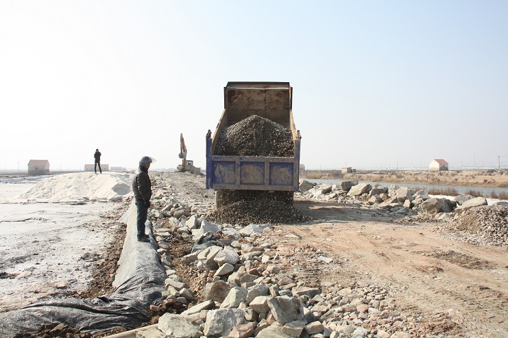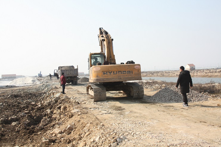 2月15日,在新河制盐公司七至十班运盐路施工现场,B体育手机官方网站入口看到南翼公司项目工程分公司的员工正在指挥两台小型工程车将石子倾倒在路基上,两台挖掘机正忙于将运送来的石子整平。运盐河对面,三辆满载土夹石的大型工程车一字排开,正等待卸载。据了解,目前正在施工的是新河制盐分公司二期运盐路维修改造工程,该工程改造路段全长3300米,计划总投资193万元,其中路基铺设部分由日晒制盐公司出资45万元,路面部分则由县交通局承担,预计需要投入148万元。该工程于去年底开始施工,预计三月中下旬全部铺设完成。另外新河制盐分公司一期一至十二班3300米运盐路改造工程计划将于今年下半年实施。
