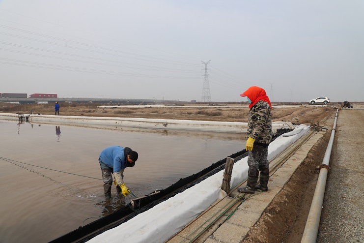 在日晒制盐新河分公司零班生产现场,该班全体员工正在班长王兴东的带领下有条不紊的忙碌着,他们有的在对绳、有的在活碴、有的在破碴。据了解,由于近期夜间气温仍然较低,导致盐池内的原盐结块现象较为严重,且对原盐质量有较大影响,因此原本于25日开始的扒盐工作现在已经全部暂停,待气温进一步升高再继续扒盐工作。