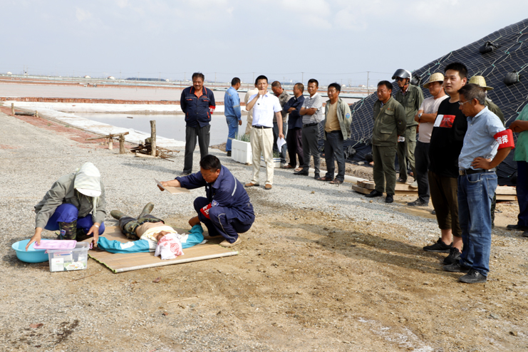 当天下午正直高温天气,室外环境闷热。现场,盐工孙良成在烈日下工作几个小时后早已汗流浃背,坚持工作一段时间后,感到头晕目眩,支持不住倒在了盐池边上。现场安全员张军连第一时间赶到现场,根据经验,初步判断倒地者出现了中暑症状。立即组织员工董志波和曹军华将孙良成抬至阴凉通风处,侧卧后仰头部,保持其呼吸畅通。并解开他身上的衣扣,一边为他扇风送凉。大伙一边用温湿毛巾不断为他擦拭身体降温,一边喂他服下藿香正气水,并用清凉油、风油精等擦拭额头位置。在现场急救迅速开展的同时,班长林树军立即向埒南分公司安全负责人江跃汇报,江跃到达现场了解情况并通知公司经理杨守斌,同时通知120急救中心,几分钟后,120急救人员赶到现场,并对中暑人员进行施救,经过紧张有序的急救,患者逐渐苏醒并初步恢复神智,抬上救护车送去医院,至此演练结束。