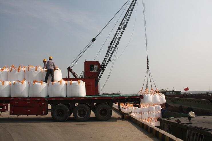 4月30日上午9时许,随着一声汽车长笛,一辆载有近40吨化工物资的卡车徐徐停靠在宵洋物流公司五灌河码头边,紧接着码头铁臂起舞,机械操作工娴熟地操纵着塔吊机械,准确地将一包包吨贷物资装卸在码头边的货船中。。。。。。自此,一辆辆满载40余吨货物的卡车源源不断向码头驶来。