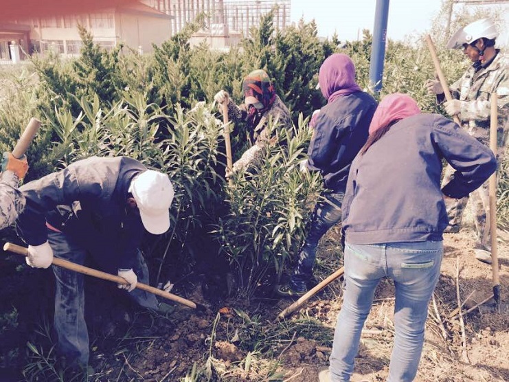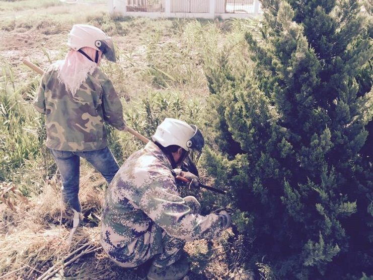 南翼绿化工人移植苗木