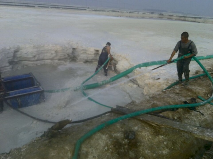 近日来,连续高温酷暑天气对日晒制盐员工提出了生理挑战,新河制盐广大员工直面高温,不畏酷暑,积极做好除硫工作,保证原盐质量。图为除硫现场操作手紧握高压水枪,对硫酸钙沉淀区进行冲刷。(新河制盐 邱利民)