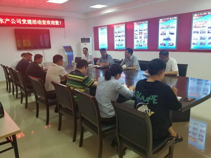 近日,西旺水产公司在该公司党建活动室召开了全体员工会议。会议传达了董事会关于公司高层人事变动的相关精神,以及公司的相关工作要求。会议由该公司董事长王德志同志主持,全体员工参加了会议。