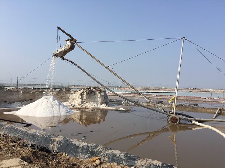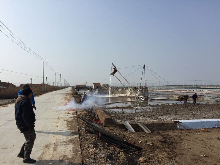 2月25日上午九点十八分,伴随着鞭炮声清脆响起,新河制盐分公司五班二号扒盐机组输盐大架银瀑飞溅,拉开了新河制盐春季扒盐的序幕。