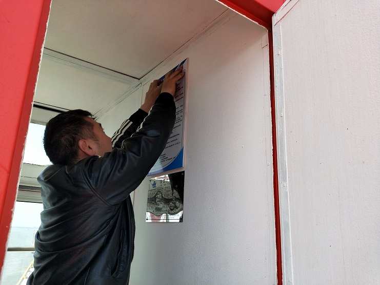 宵洋物流公司强化安全生产工作。近期,宵洋物流公司维修人员,在码头起重吊机底座、驾舱内张贴安全警示和吊机驾驶员规章制度图片,时刻提醒码头作业人员安全作业。自码头吨袋吊装业务三月十八日正式启动以来,安全作业状况良好。(宵洋物流公司)