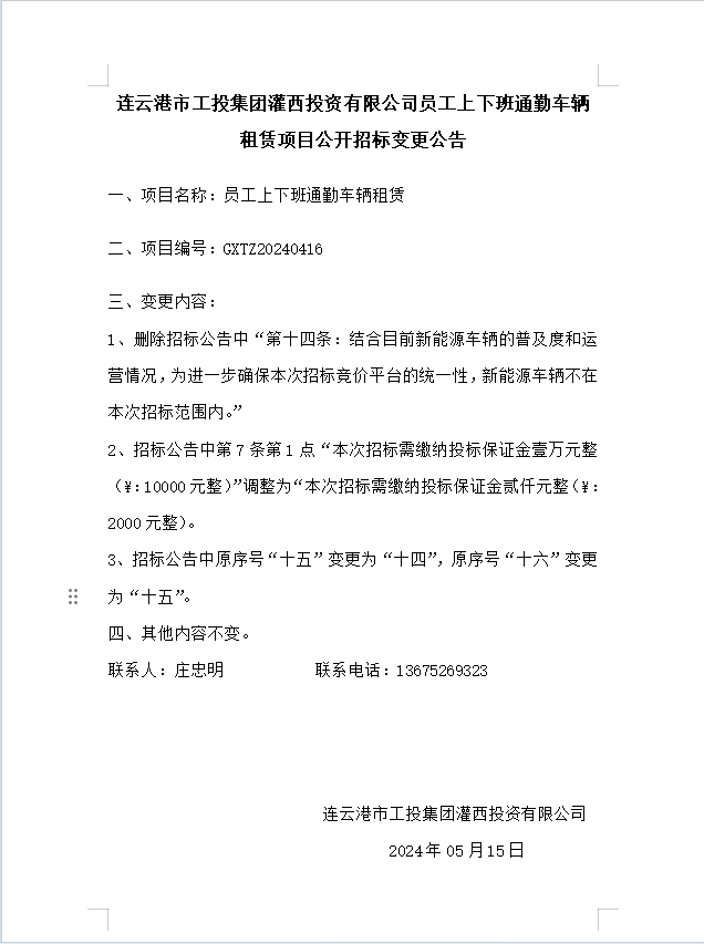 连云港市工投B体育(中国)灌西投资有限公司员工上下班通勤车辆租赁项目公开招标变更公告