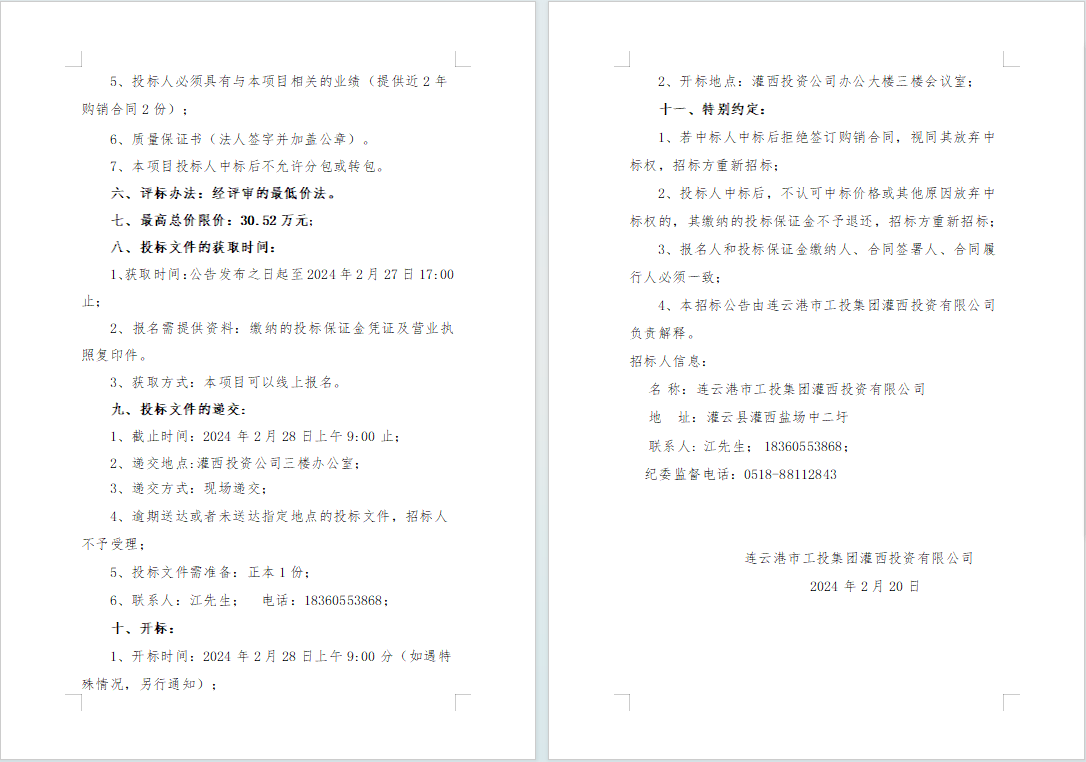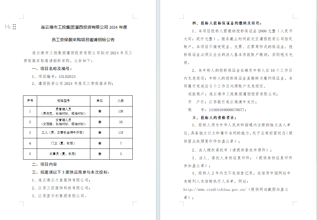 连云港市工投B体育(中国)灌西投资有限公司2024年度员工劳保服采购项目邀请招标公告