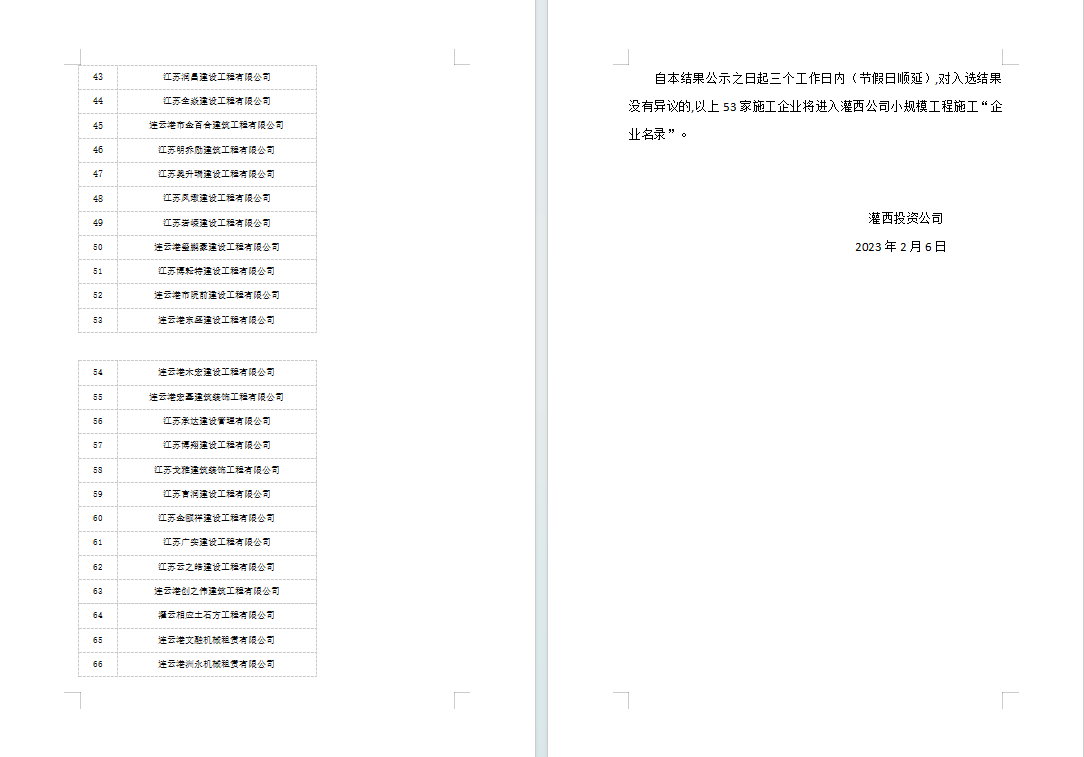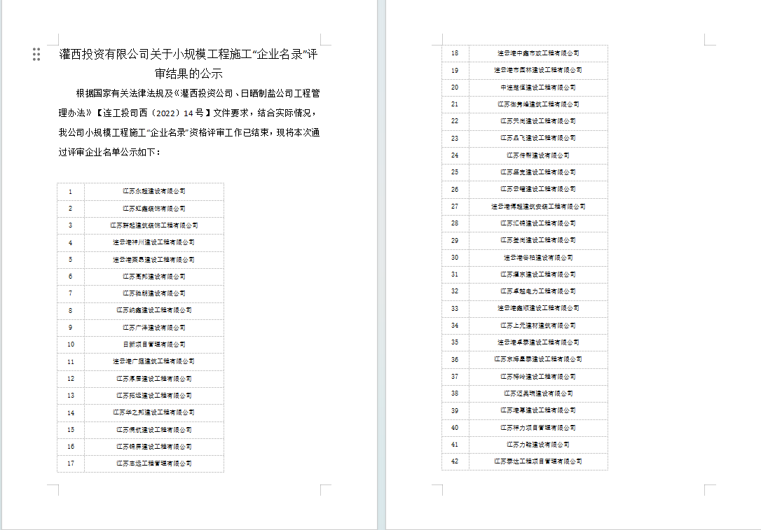 灌西投资有限公司关于小规模工程施工“企业名录”评审结果的公示