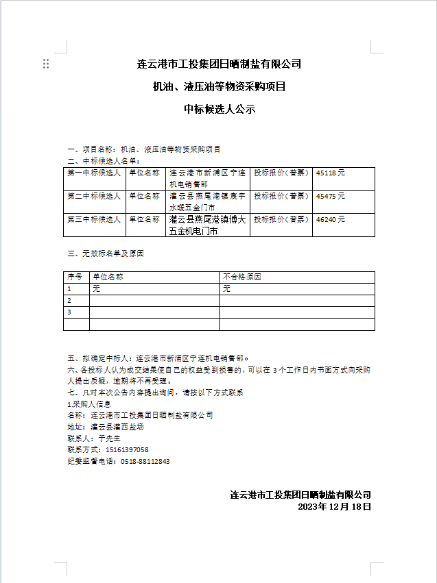 连云港市工投B体育(中国)日晒制盐有限公司 机油、液压油等物资采购项目中标候选人公示