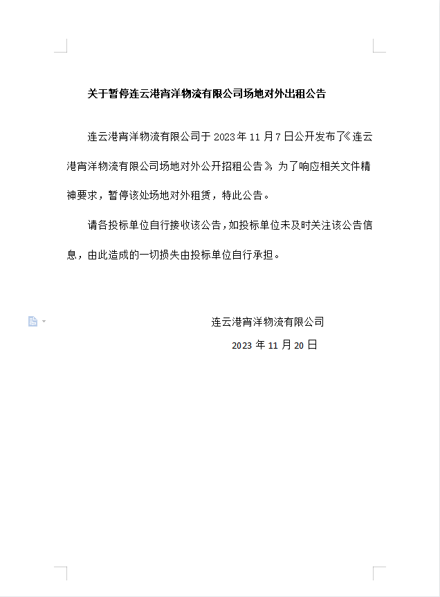 关于暂停连云港宵洋物流有限公司场地对外出租公告