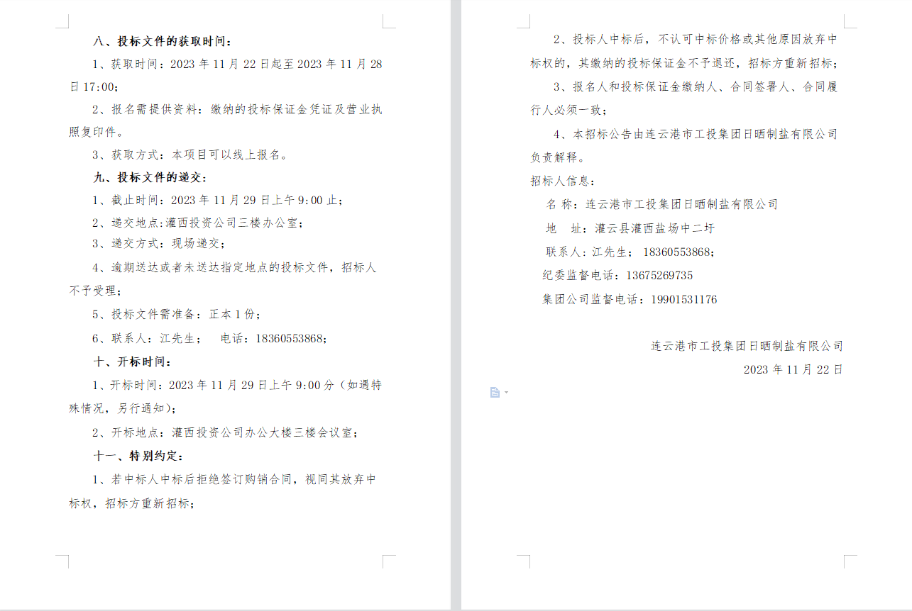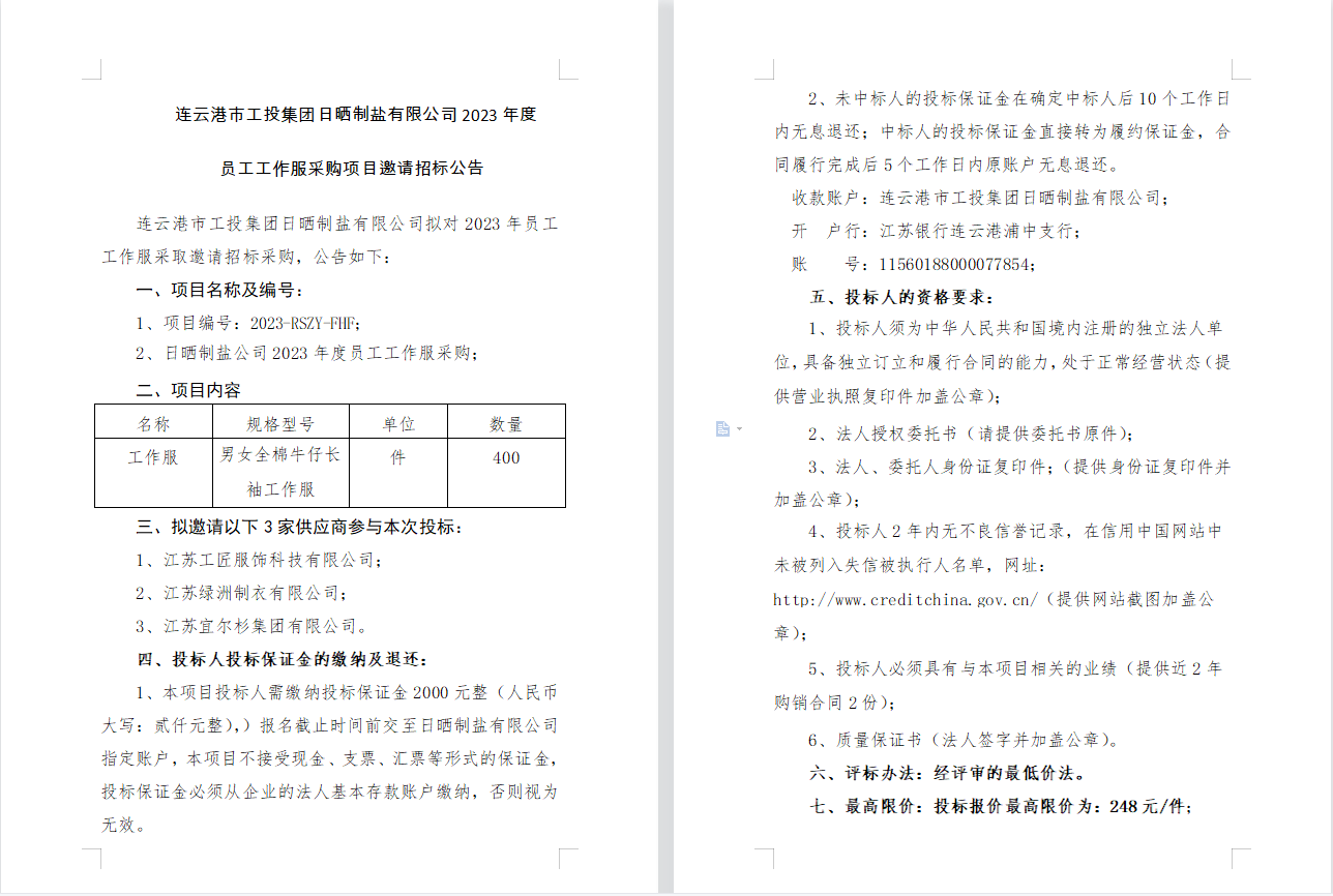 连云港市工投B体育(中国)日晒制盐有限公司2023年度员工工作服采购项目邀请招标公告