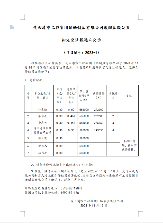 连云港市工投B体育(中国)日晒制盐有限公司废旧盐膜处置拟定受让候选人公示