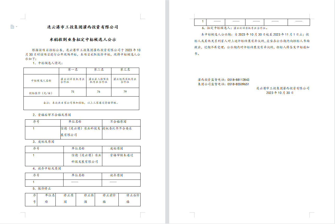 连云港市工投B体育(中国)灌西投资有限公司水稻收割业务拟定中标候选人公示