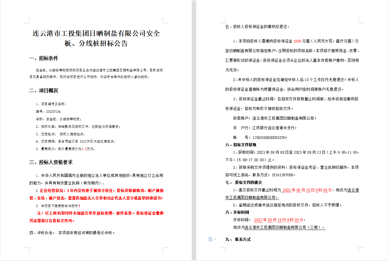 连云港市工投B体育(中国)日晒制盐有限公司安全板、分线桩招标公告