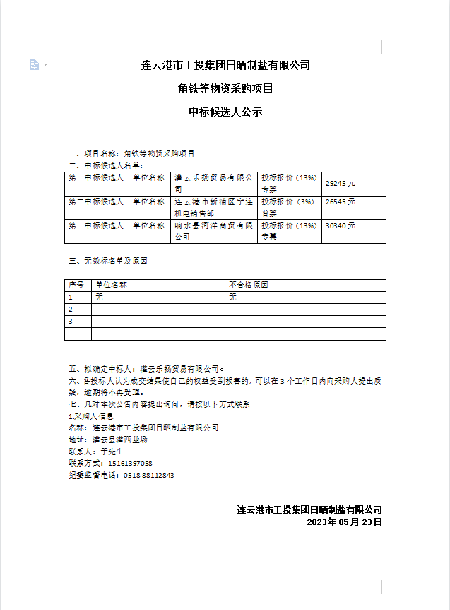 连云港市工投B体育(中国)日晒制盐有限公司角铁等物资采购项目中标候选人公示