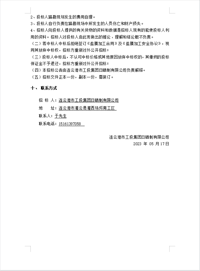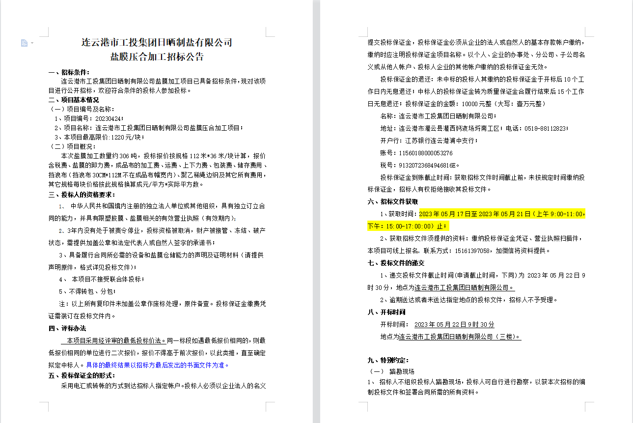 连云港市工投B体育(中国)日晒制盐有限公司盐膜压合加工招标公告