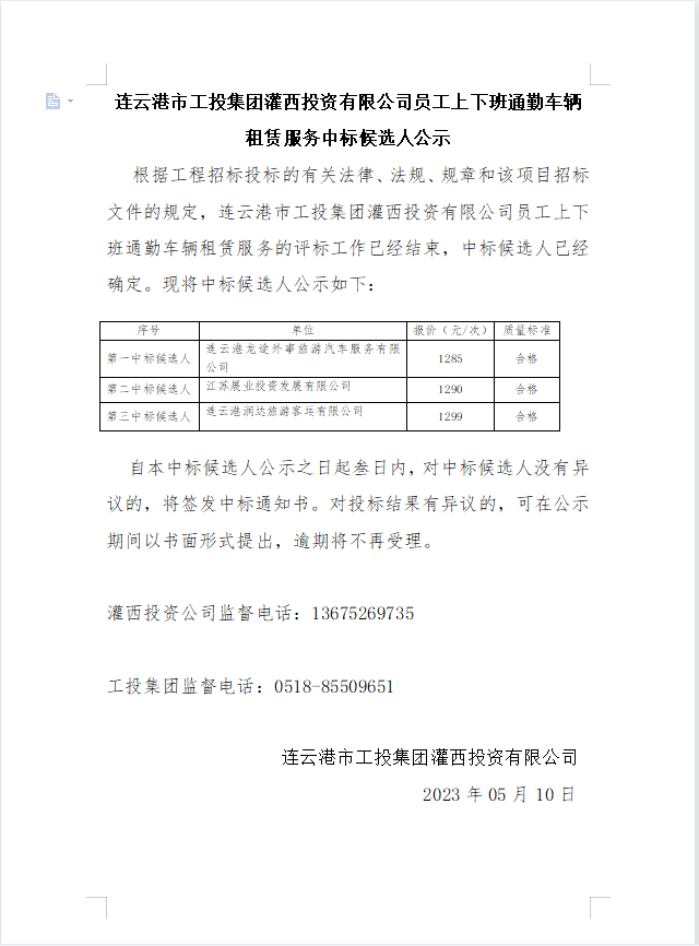 连云港市工投B体育(中国)灌西投资有限公司员工上下班通勤车辆租赁服务中标候选人公示