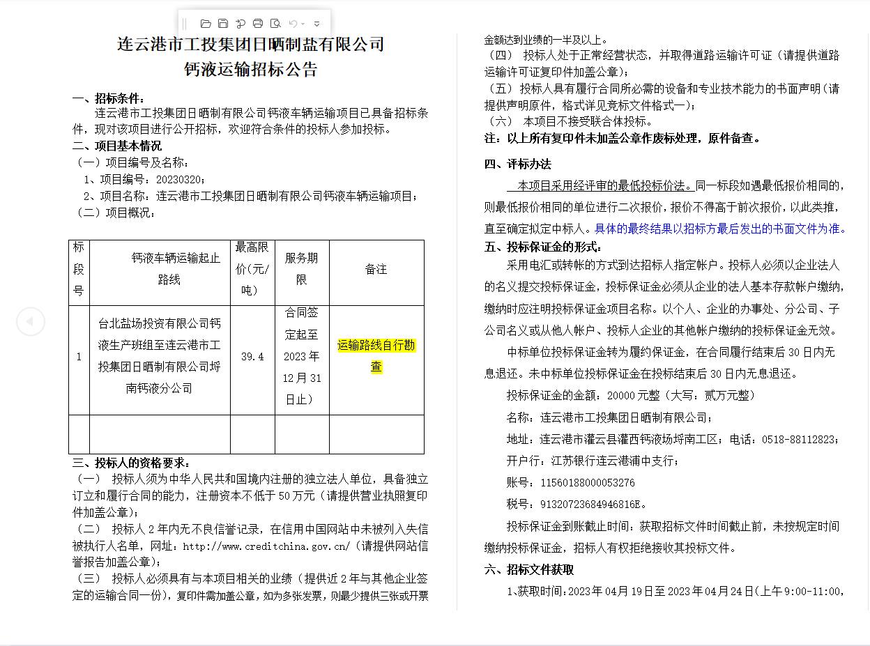 连云港市工投B体育(中国)日晒制盐有限公司钙液运输招标公告