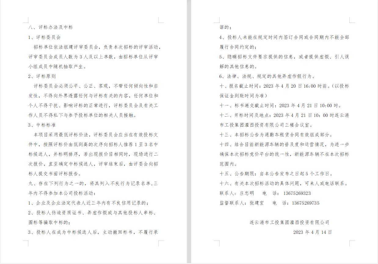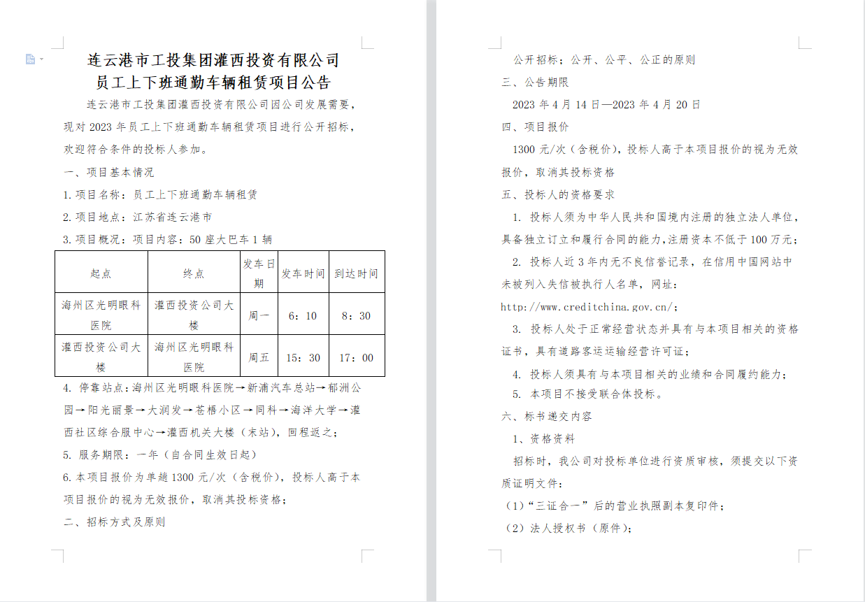 连云港市工投B体育(中国)灌西投资有限公司 员工上下班通勤车辆租赁项目公告