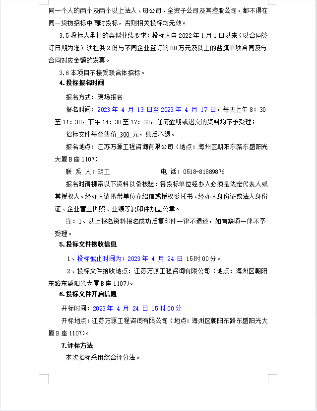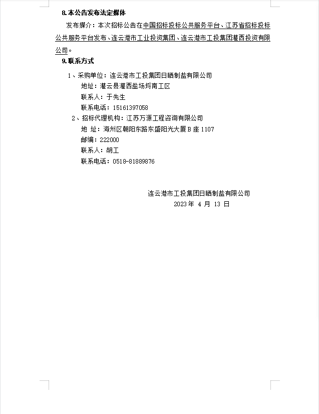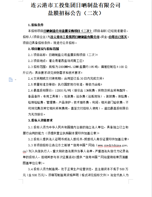 连云港市工投B体育(中国)日晒制盐有限公司盐膜招标公告(二次)