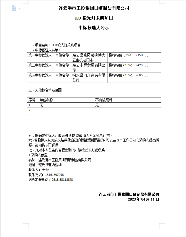 连云港市工投B体育(中国)日晒制盐有限公司LED投光灯采购项目中标候选人公示