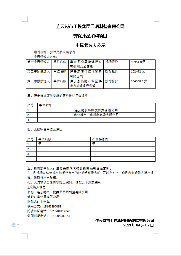 连云港市工投B体育(中国)日晒制盐有限公司劳保用品采购项目