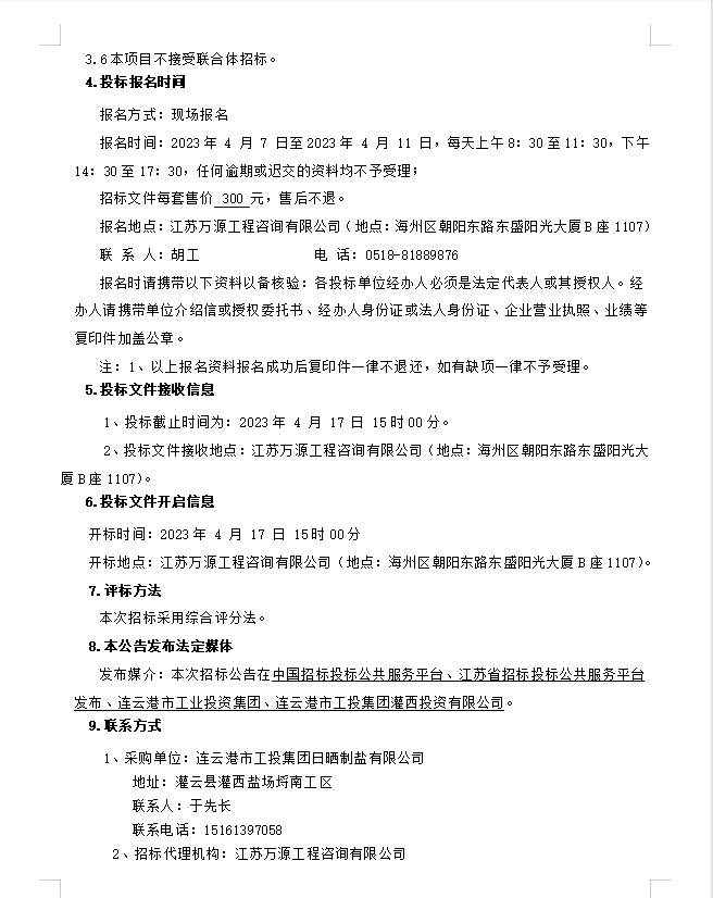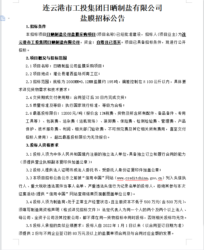 连云港市工投B体育(中国)日晒制盐有限公司盐膜招标公告
