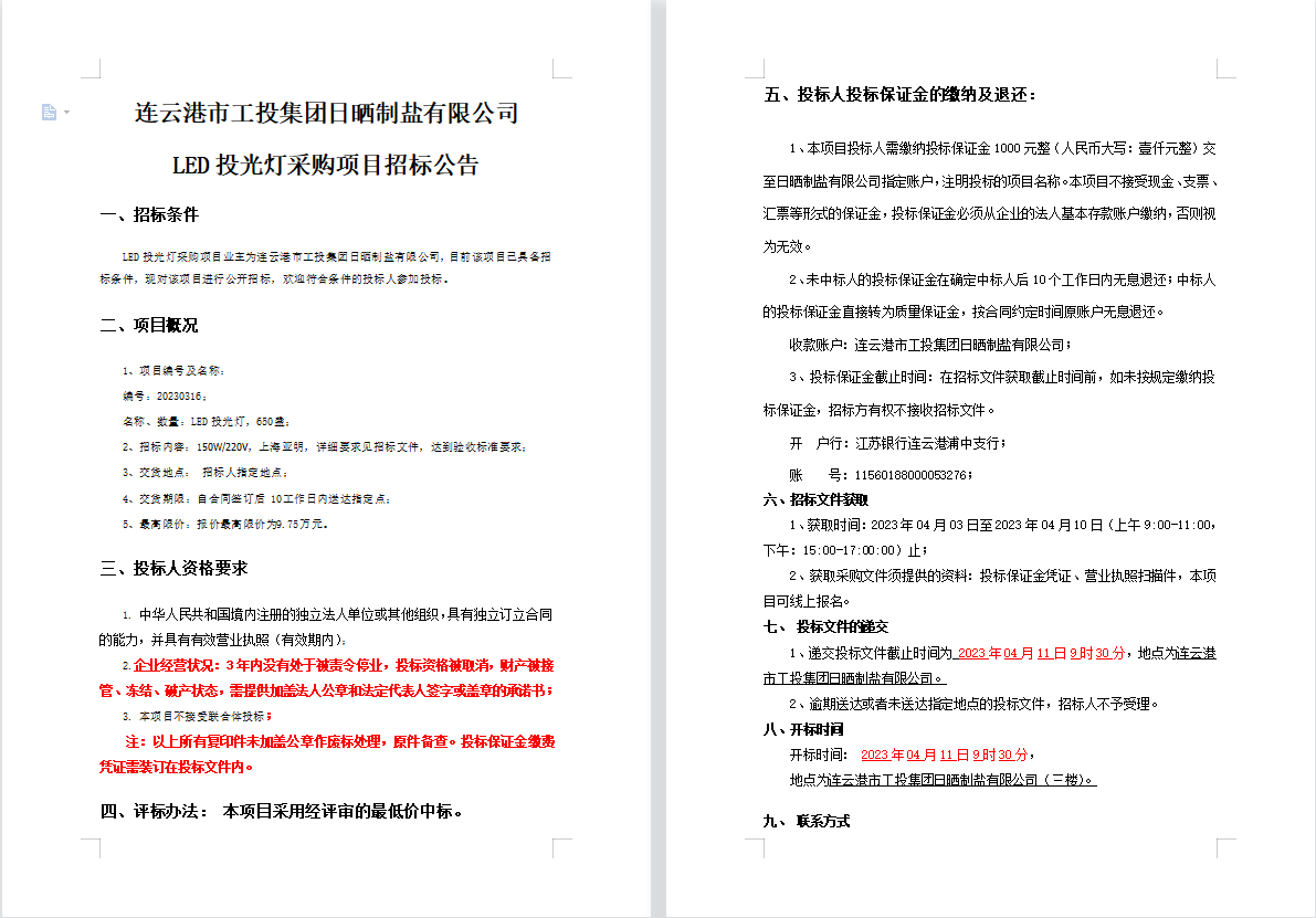 连云港市工投B体育(中国)日晒制盐有限公司LED投光灯采购项目招标公告