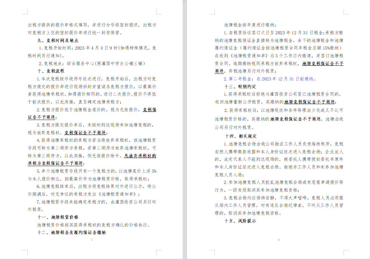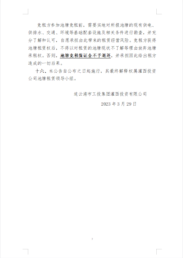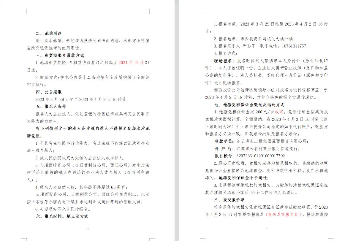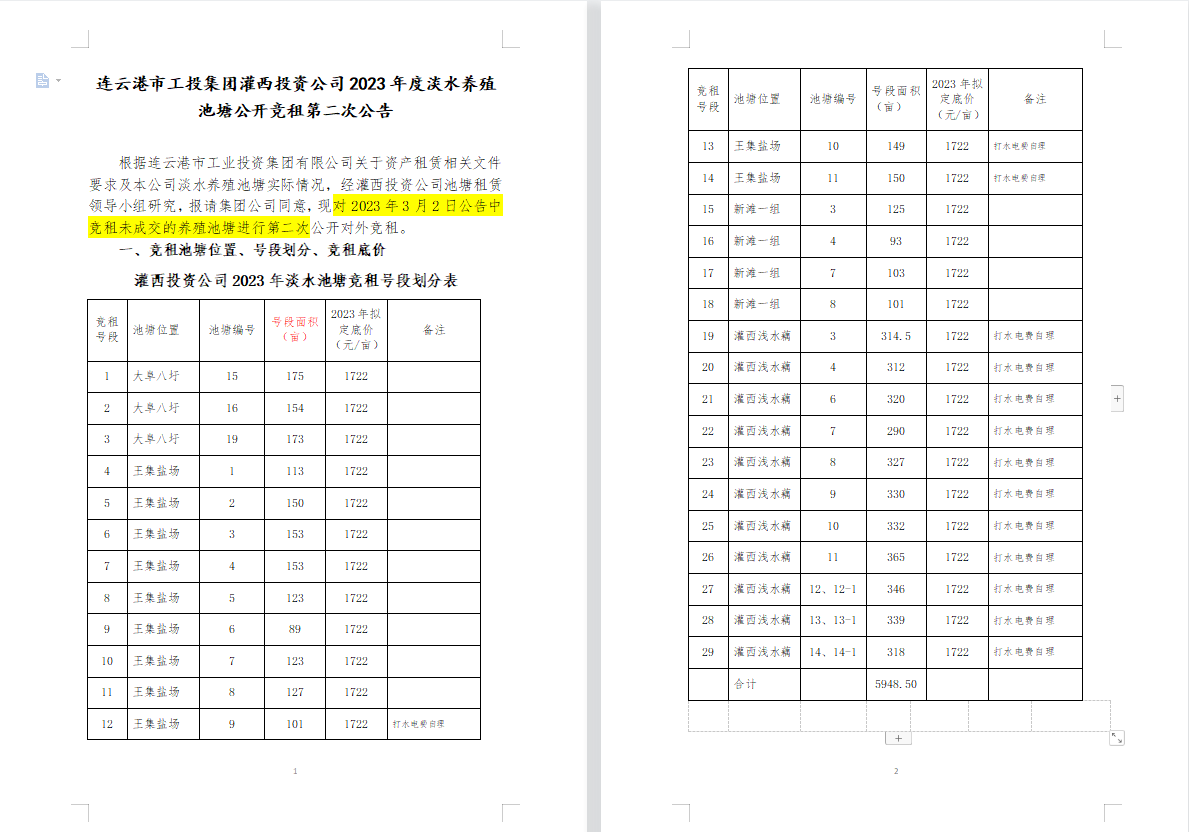 连云港市工投B体育(中国)灌西投资公司2023年度淡水养殖池塘公开竞租第二次公告