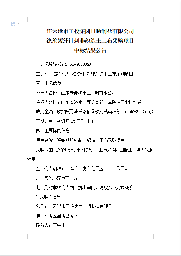 连云港市工投B体育(中国)日晒制盐有限公司涤纶短纤针刺非织造土工布采购项目中标结果公告