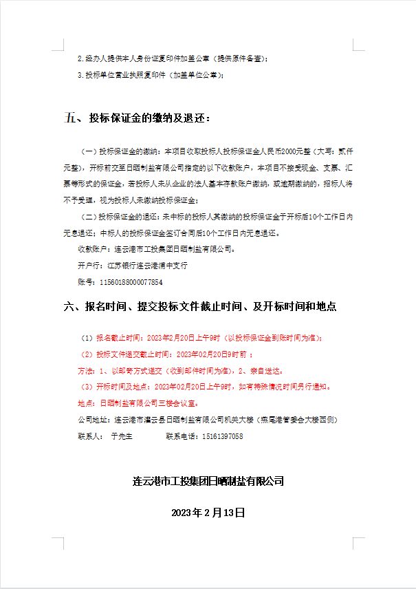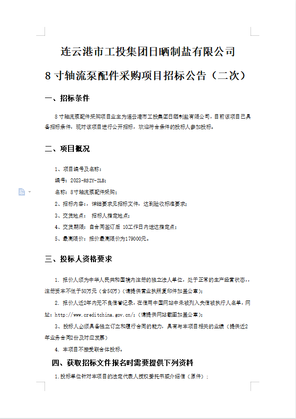 连云港市工投B体育(中国)日晒制盐有限公司8寸轴流泵配件采购项目招标公告(二次)