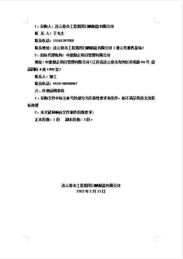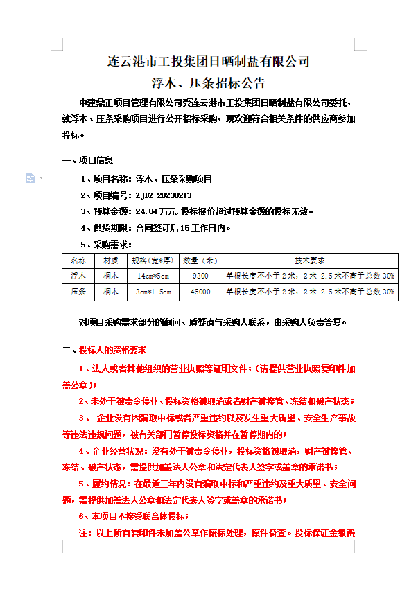 连云港市工投B体育(中国)日晒制盐有限公司浮木、压条招标公告