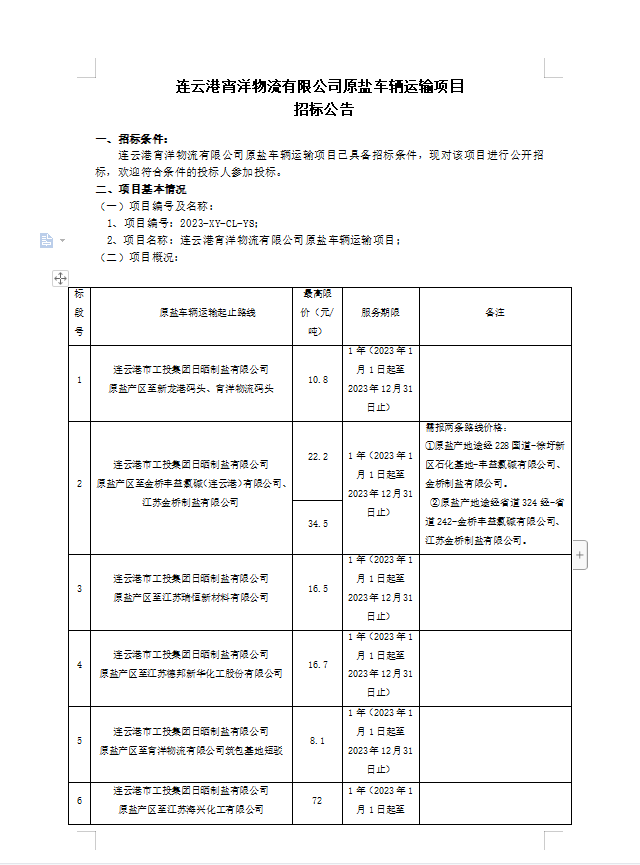 连云港宵洋物流有限公司原盐车辆运输项目招标公告