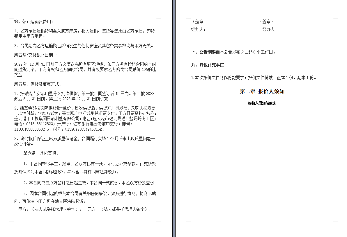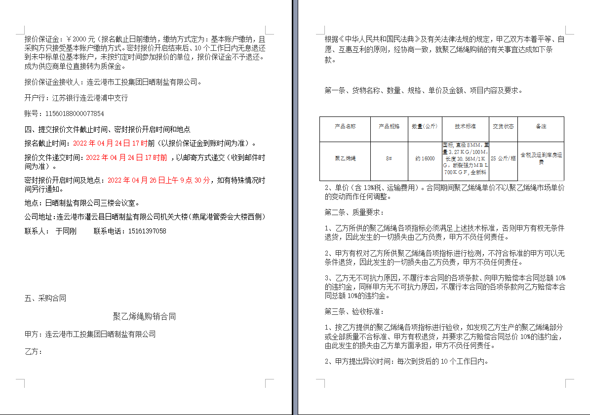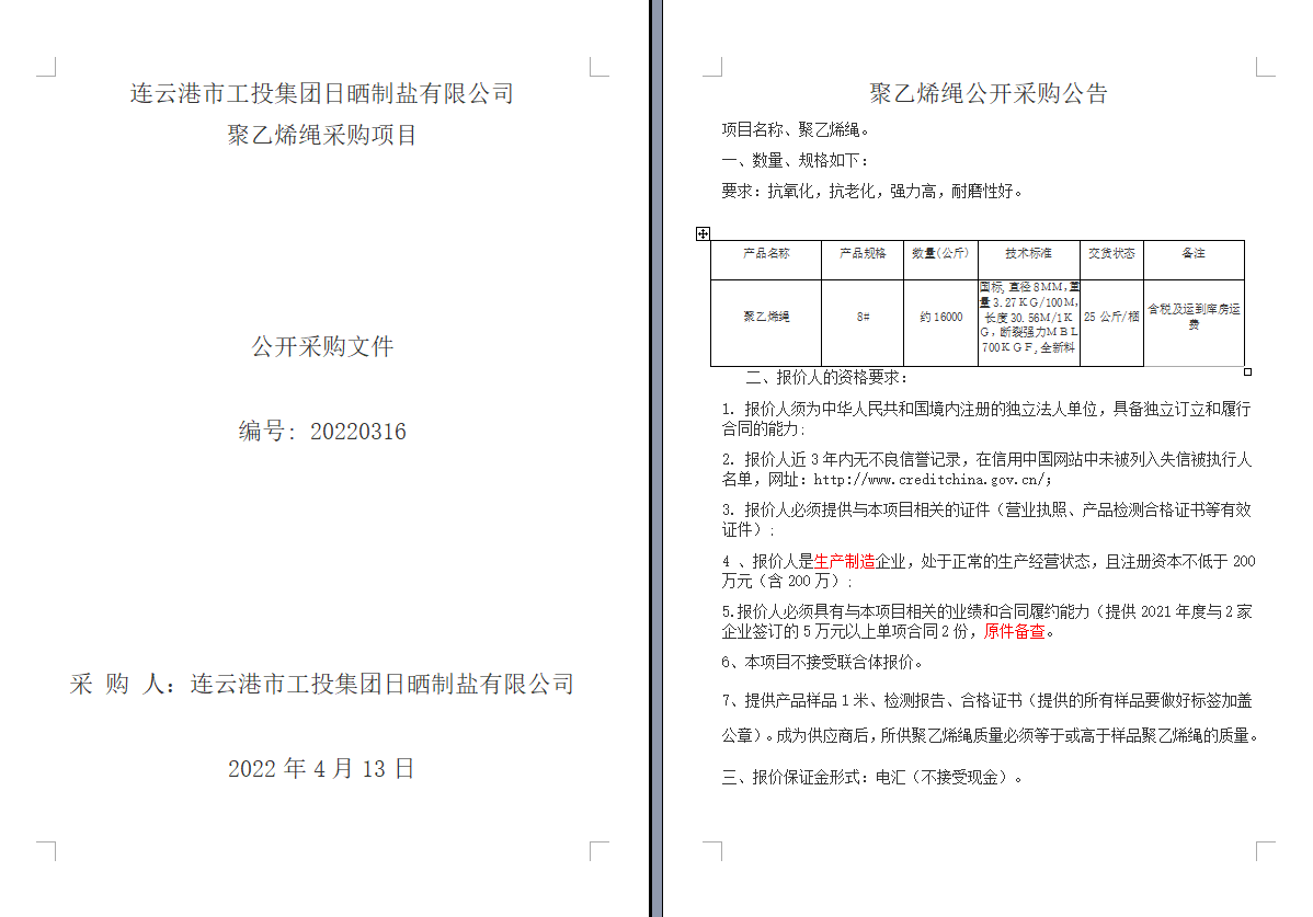 连云港市工投B体育(中国)日晒制盐有限公司聚乙烯绳采购项目