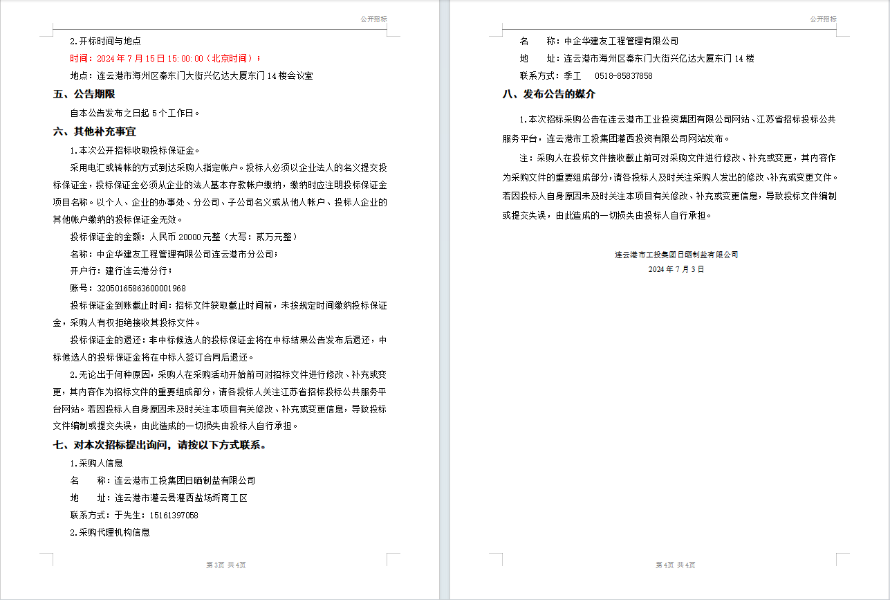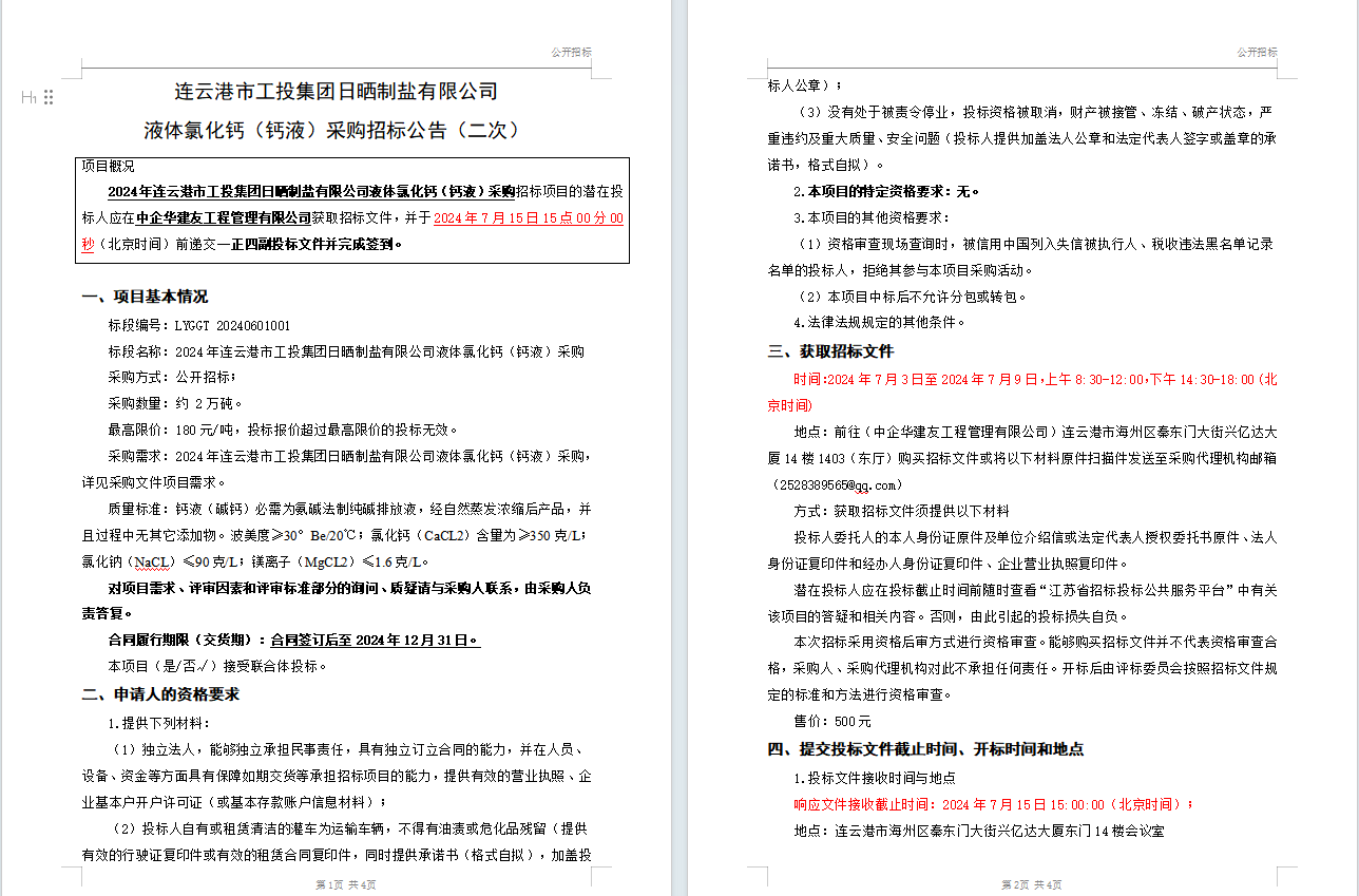 连云港市工投B体育(中国)日晒制盐有限公司液体氯化钙(钙液)采购招标公告(二次)