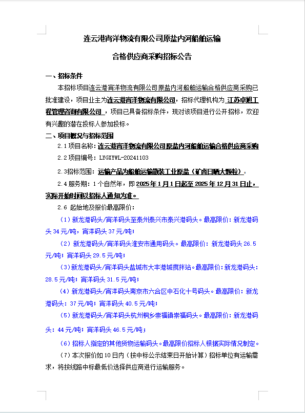 连云港宵洋物流有限公司原盐内河船舶运输合格供应商采购招标公告