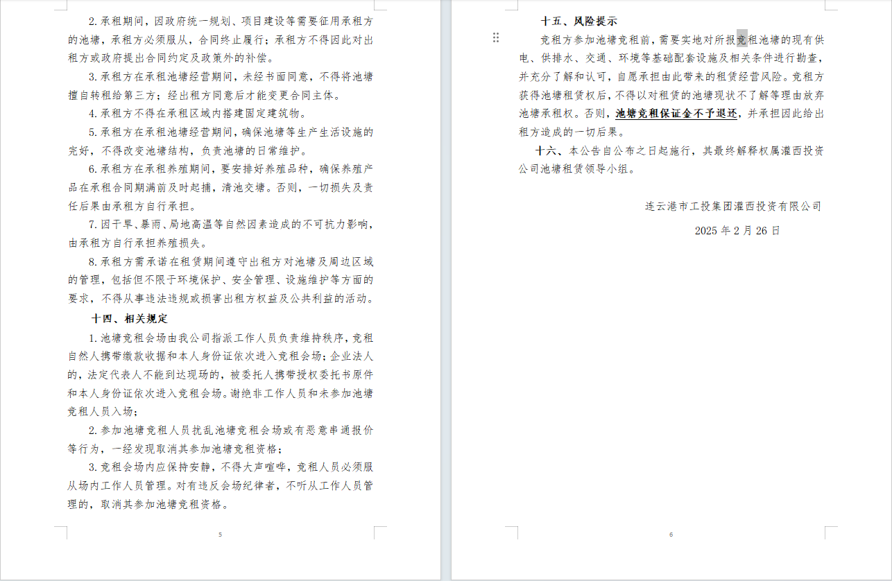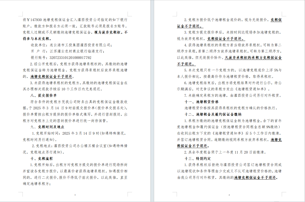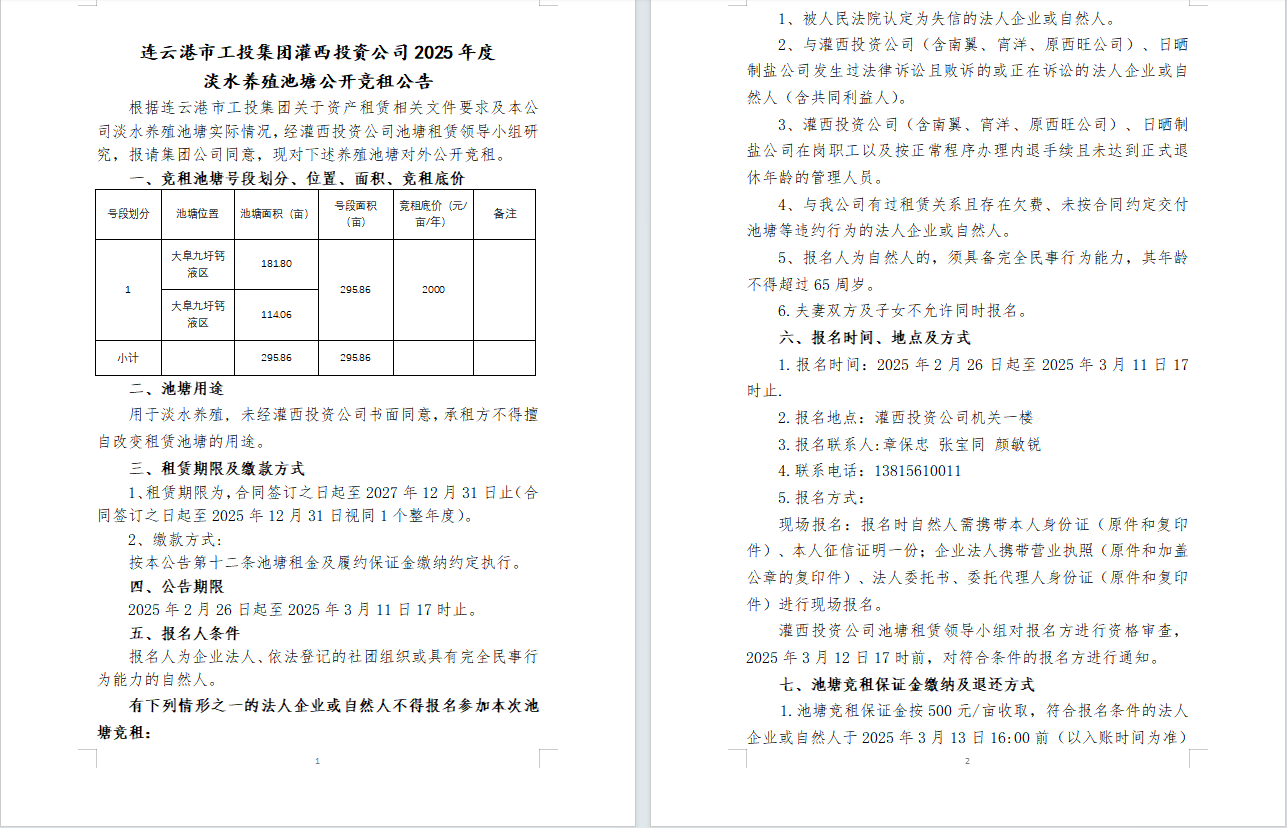 连云港市工投B体育(中国)灌西投资公司2025年度淡水养殖池塘公开竞租公告